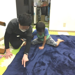 利用児さんは、カーペットに被せたじゅうたんの上を裸足で走ってみたり、
